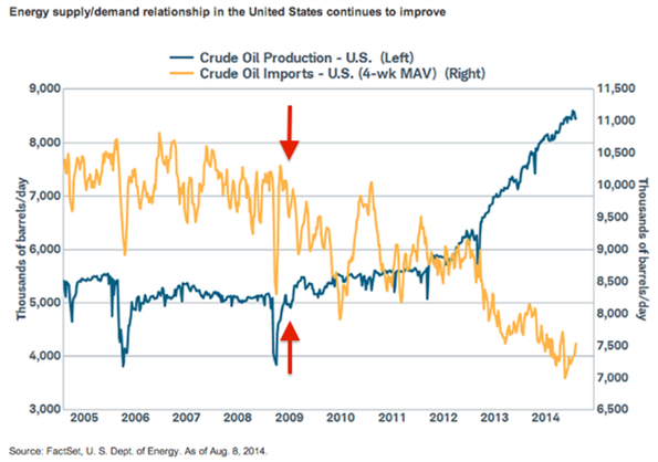 Samtidigt befinner sig den amerikanska oljeimporten på den lägsta nivån på 19 år, 7,17 miljoner fat per dag (bbl/d) i maj. Diagrammet nedan visar det hela ur en helt annan vinkel, det visar hur skifferrevolutionen kom precis när den amerikanska ekonomin behövde det.