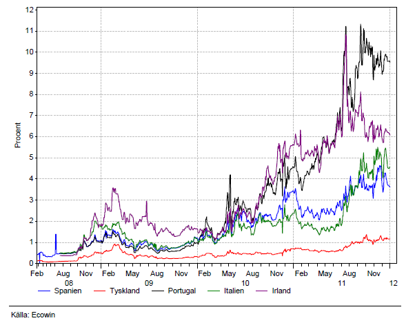 Priset att försäkra ett lån till utvalda länder i Europa, här som CDS:er visar tydligt hur krisen eskalerat under året.