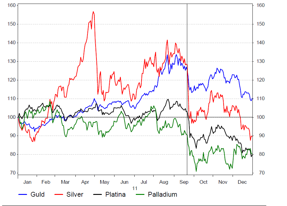 Silver har åkt berg och dalbana och både berikat och bedrövat investerare. De mer industriellt exponerade palladium och platina handlades jämförelsevis stillsamt fram till raset i september. Året slutade dock i moll för ädelmetallerna. Guld föll till sex månaders lägsta 1 531 dollar efter att nått sitt nominella rekord på 1 920 dollar i början av september.