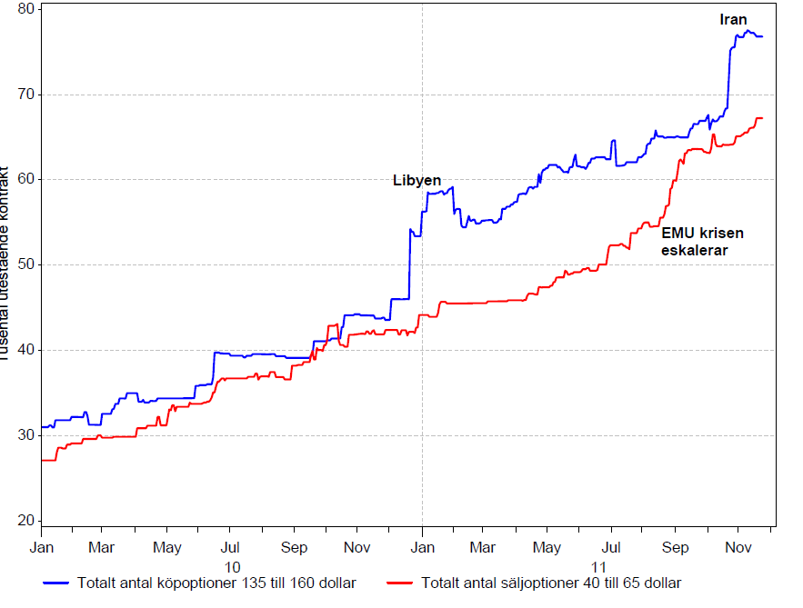 I figuren ovan kan man tydligt se att riskerna på uppsidan har betraktats som större av marknaden fram till det att EMU krisen eskalerade i september och många skaffade säljoptioner. Därefter har riskerna för högre priser åter dragit ifrån efter oron kring Iran.