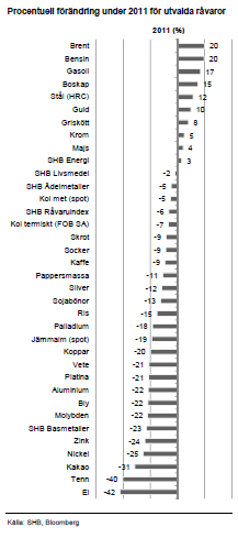 Så här långt har den enda reaktionen från producenterna på de lägre priserna handlat om att högkostnadsproduktion i Kina av aluminium och nickel fått stänga ner. På rådande nivåer förväntar vi oss inte att övriga världen kommer att stänga ner någon produktion. Risken är alltså att det kommer råda överskott på marknaden under första halvåret 2012. Om 2011 var året då vi fick se första halvårets uppgångar raderas under andra halvåret så tror vi att 2012 kommer bli tvärt om. Basmetallerna kommer vända upp under andra halvåret och sluta klart högre än de slutade 2011.