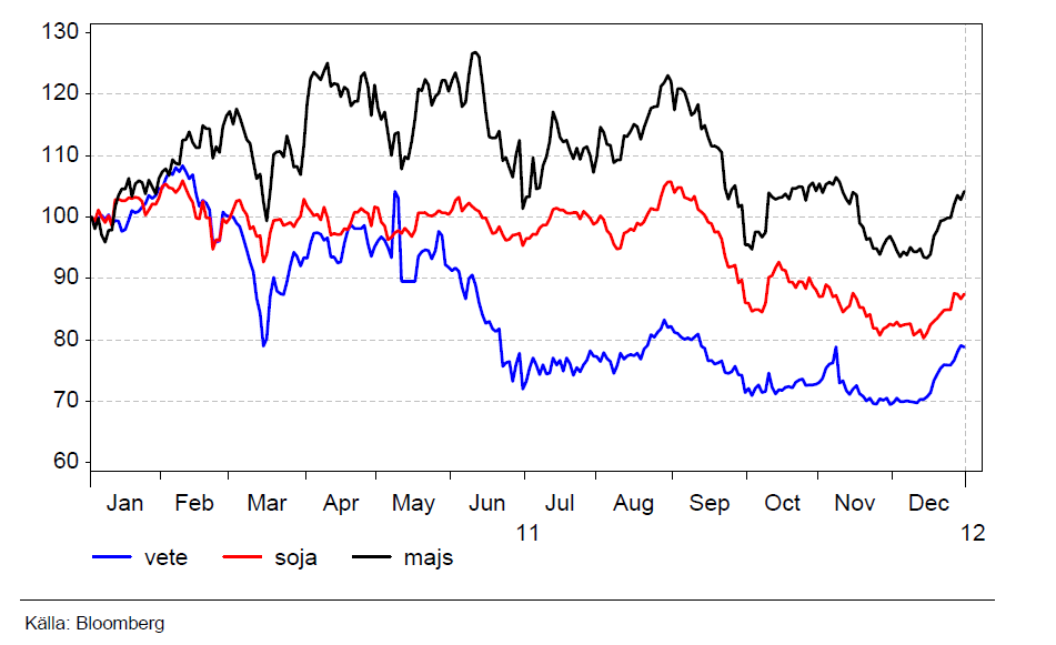 Speciellt prisdrivande under året har den amerikanska majsen varit, vars låga lagernivå gjort marknaden extra känslig för produktionsstörningar. Majsen konkurrerar med vetet som fodergröda och med sojabönorna om areal, vilket gjort att majsen påverkat de andra två stora grödorna hela året. Av stor betydelse för prisbilden fick som väntat även Rysslands kraftiga återkomst på exportmarknaden för vete, vilket tillsammans med överlag goda skördar runt om i världen pressade priserna under det senare halvåret. Torrt väder i främst Argentina, som följt med oss in även i år 2012, fick dock priserna att återhämta en stor del av tidigare nedgång. Helt klart påverkades priserna i hög grad även av ekonomiska problem i inte minst EU och USA, med stora prisfall främst i september som följd.