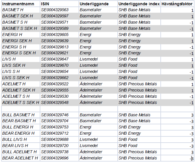 SHB råvaror sektorindex
