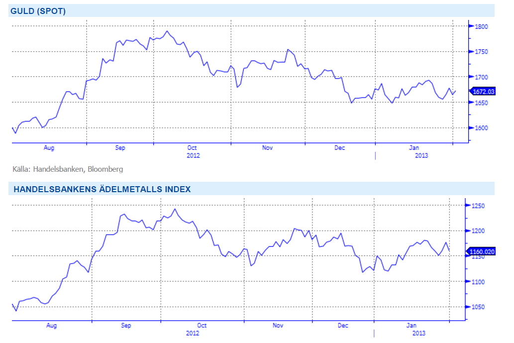 Vår positiva syn sedan dess har byggt på två hörnstenar, nämligen den extrema stimulans som centralbanker världen över ägnar sig åt, och de stigande inflationsförväntningar som kommer med detta. Årets starka inledning på världens aktiemarknader, och de positiva konjunktursignaler vi fått, och det något minskade fokus som rått på euro-krisen gör att vi tror att det positiva risksentimentet fortsätter. Potentiellt stigande räntenivåer, fortsatt riskaptit kombinerat med utebliven prisuppgång på guldet får oss att tro att nästa stora rörelse kommer att vara nedåt.