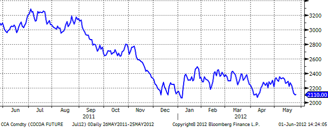 Den rådande ekonomiska situationen i Europa fortsätter påverka priset även på kakao. Ett eventuellt grekiskt utträde ur euroområdet, Egan-Jones Rating Co:s sänkning av spaniens kreditbetyg samt en långsammare asiatisk tillväxt är alla faktorer som kan komma att påverka efterfrågan på kakao.