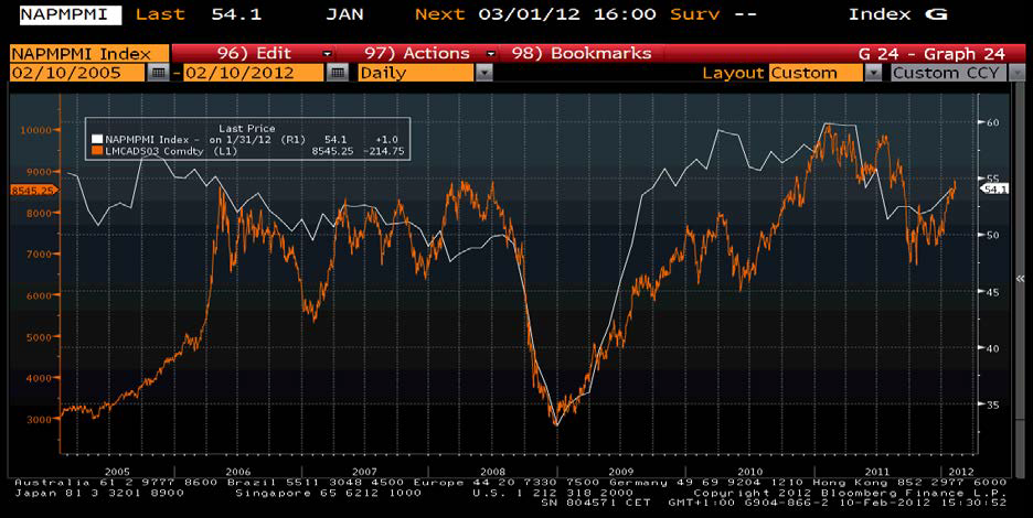 Bilden nedan visar kopparpriset (orange) och inköpschefsindex för USA (PMI). Indexet brukar vara anses vara en god indikator på vart ekonomin är på väg och tolkas som en framåtblickande indikator. Givetvis vill ekonomiska bedömare följa någon ännu bättre ekonomisk indikator och ibland används kopparpriset som en sådan. Följsamheten mot den ekonomiska utvecklingen har de senaste åren varit god (före år 2005 var den inte lika god). Slutsatsen blir därför att hålla reda på kopparpriset för att få en känsla för vartåt ekonomin är på väg.