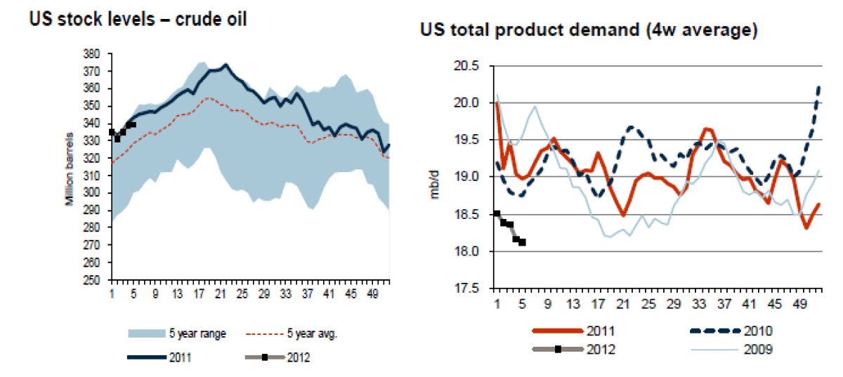 Oljepriset (Brent) stärktes 2,2% i veckan till $ 117.2/fat. Den geopolitiska oron har ökat i Mellanöstern med oro i Syrien och Irans hot mot USA, vilket hjälpte till att pressa upp oljepriset till $ 118.8/fat i torsdags. Irans oljeexport kommer påverkas allvarligt av sanktionerna mot landet i mars. Siffror om den amerikanska efterfrågan på olja är för närvarande svåra att relatera till, eftersom förutsättningarna för export för tillfället är väldigt osäkra. Samtidigt har hösten / vintern präglats av varma temperaturer, medan det motsatta var fallet förra året. Siffrorna för efterfrågan denna vecka anges till 17.6m fat / dag, att jämföra med 18.7m fat / dag vid samma tidpunkt förra veckan. Råoljelagert steg den här veckan med 0,3 M fat (väntat 2,4 m), destillat ökade med 1,2 m fat (väntat 0,7), medan bensin ökade med 1,6 miljoner fat (väntat 0,7).