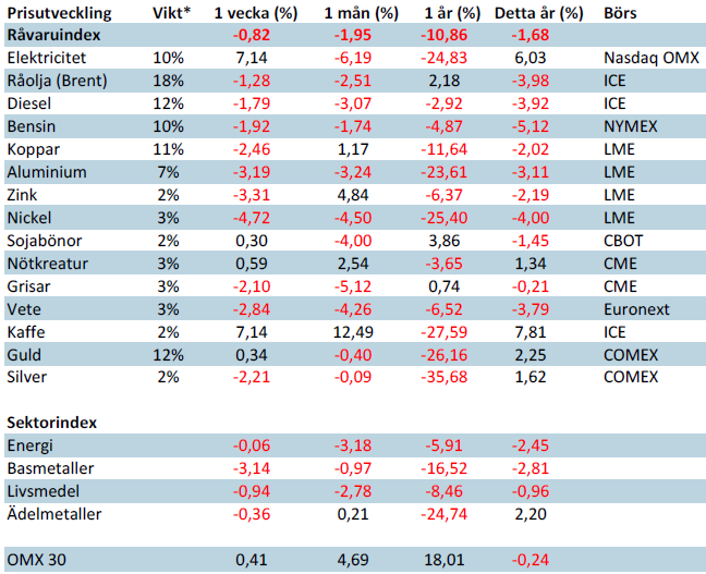 *Uppdaterade vikter från 29 november 2013. Handelsbankens råvaruindex består av de underliggande indexen för respektive råvara. Vikterna är bestämda till hälften från värdet av nordisk produktion (globala produktionen för sektorindex) och till hälften från likviditeten i terminskontrakten.