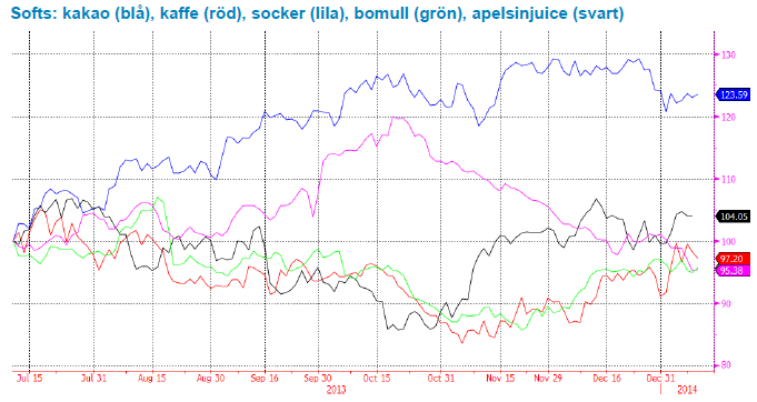 Terminspriserna på samtliga mjuka råvaror steg under årets sista månader med undantag för socker, där vi för tillfället har ett överskott på marknaden. Kakao tillhör årets vinnare kaffe årets förlorare. Terminspriserna på kaffe har haft en fantastisk utveckling sedan i mitten av december. Vändningen kom efter flera år av fallande priser där produktionen överstigit konsumtionen. Trots ett off-år förra året har kaffeåret 2012/2013 bjudit på goda skördar. Många kaffeodlare går idag med förlust och oron kring utbudsstörningar på sikt ökar. Kommer kaffeproducenterna att bli tvungna att överge sin råvara? Andra faktorer som gett stöd till den senaste tidens terminspriser är de ökade produktionskostnaderna samt sämre kvalité på förra årets skörd som följd av sämre väderförhållanden.