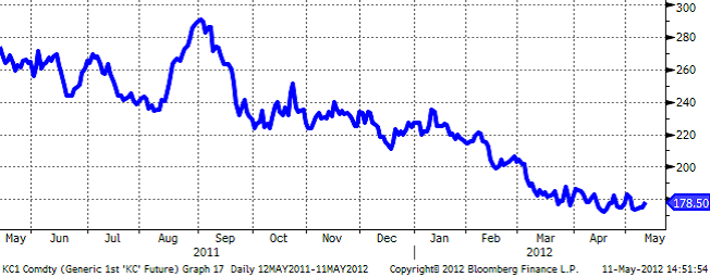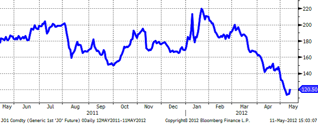 Priset på apelsinjuice fortsätter vara lågt, utbudet överstiger efterfrågan kraftigt och de ökade oroligheterna i Europa den gångna veckan fick en allt annat än positiv reaktion på priset. Väderleksrapporterna i början av veckan talade för regn i Florida den kommande 10 dagars perioden, gynnsamt för skörden men även detta negativt för prisutvecklingen. Man talar om apelsinjuice som den ”sämst presterande råvaran 2012”. Mot slutet av veckan har vi sett en mindre prisuppgång baserat på nya rapporter inför Floridas orkansäsong. Orkansäsongen sträcker sig från 1 juli till 30 november och tros i år bjuda på 12 namngivna orkaner. Antalet orkaner är visserligen mindre än tidigare år men räckte för att påminna marknaden om att orkansäsongen är på ingång och det räcker med en större orkan för att orsaka avsevärda skador på skörden.