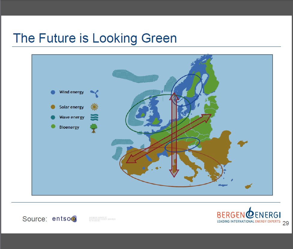 På utbudssidan finns det tyvärr större utmaningar. Kärnkraften står för en mindre och mindre del av Europas energimix och med Tysklands nedstängning ser det ännu sämre ut. Italien har röstat emot en start av deras reaktor och Schweiz har beslutat att stänga ned kärnkraften 2034. Däremot har Europa beslutat att bygga ut förnyelsebara energikällor kraftigt. Utmaningen med expansionen är att elnätet inte är utbyggt för en storskalig överföring av el nord-syd och sydväst-nordöst (se bild). Enorma summor måste investeras för att koppla ihop Europa i ett fungerande elnät.