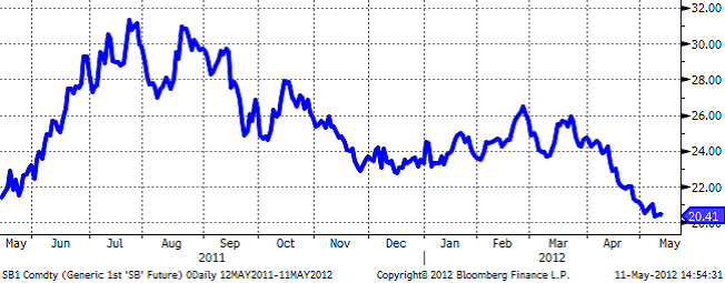 Socker handlades upp något i början av veckan till följd av det något torrare vädret i Brasilien och därmed risk för sämre skördar. Även en något ökad efterfrågan och rapporter om ökat antal lastfartyg vid de brasilianska hamnarna redo för lastning av råvaran fick priset att stiga. Det ekonomiska läget i Europa fick priset på socker att sjunka igen mot mitten av veckan och handlas fortsättningsvis lågt. Marknaden är något avvaktande inför brasilianska skördeperioden som inleds om bara några veckor, och inväntar även handeln inför ramadan som hittills varit modest. Ramadan inleds i juli och de muslimska länderna brukar fylla sina lager innan dess. Indien som förra veckan beslöt att tillåta obegränsad export av socker har inte publicerat sin planerade exportvolym. Indiens skördar är goda i år och det socker de inte exporterar i år har de möjlighet att lagra för export nästa år, vilket i sin tur kan påverka priset på sikt.