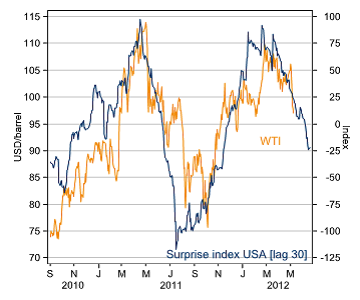 - Den starka utvecklingen för amerikanska aktier har toppat och i takt med att makrodata i USA inte har överraskat positivt så har aktiemarknaden flackat ut på andra sidan atlanten och minskat det positiva sentimentet. Olja har följt samma mönster som USAs makrodata i förhållande till förväntningarna men med en månads eftersläpning. Se figur nedan.