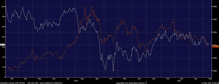 Vi återtar vår negativa syn på ädelmetaller, drivet av att guldet fortsätter underprestera även när risksentimentet är så negativt som det är just nu. Alla dåliga nyheter vi fått oss serverade denna vecka hade för ett år sedan skickat upp guldpriset rejält, men denna vecka har det fortsatt att falla. Guldet har fallit med 3,5 %, och silvret (guldets busige lillebror) med över 5 %. Utöver vår gamla teori att marknaden blev lång på fel nivåer förra sommaren kan vi inte komma på en bättre förklaring än att guldet handlar som basmetallerna sedan 9 månader tillbaks. Bilden nedan visa guldpriset (röd linje) och kopparpriset (vit) som fram till det stora fallet i september rörde sig i stort sett diametralt mot varandra, för att därefter börja röra sig ganska lika. Under 2012 har de rört sig skrämmande lika… Vi får anledning att komma tillbaks med teorier om varför det blivit på detta sätt, men för idag nöjer vi oss med att konstatera: Guldet är inte värt att hålla som skydd mot riskaversion eller Eurokriser, inte heller som skydd mot börsfall. Inte just nu iallafall. Därför återtar vi – med självförtroende – vår negativa sektorvy på ädelmetaller!