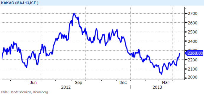 Världsmarknadspriset på kakao nådde årshögsta (2744 dollar/ton) under september förra året. Detta som en följd av uteblivet regn och temperaturer över normalen under odlingssäsongen i regioner kring Elfenbenskusten, världens största kakaoexportör. Det råder därför osäkerhet kring storleken och kvalitén på årets skörd och priskurvan har varit uppåtgående sen i början av mars. Under de senaste två åren har priset fallit ca 20 procent som en följd av goda väderförhållanden och höga skördar som har varit huvudorsaken till överskott på kakao. Men de låga kakaopriserna har lett till att fler och fler kakaoodlare överväger att odla andra tropiska råvaror samtidigt som kakaokonsumtionen utanför Europa och Nordamerika ökar. Med risk för minskad produktion och i takt med stigande konsumtion i tillväxtländerna tror vi på fortsatt uppgång av priset.