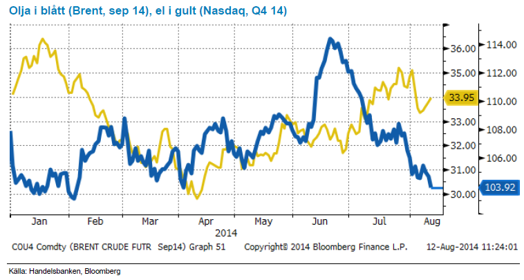 I oljemarknaden har den politiska utvecklingen i Ryssland/Ukraina samt Mellanöstern överskuggat den normalt starka efterfrågan under sommaren från ”driving season”, och både brent och den USA-handlade WTI har fallit kraftigt sedan toppen i juni.