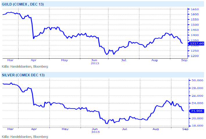 Oljan föll med över 4 procent som mest efter att risken för en amerikansk intervention och upptrappning av konflikten kring Syrien minskat. Marknaden finner dock stöd mot slutet av veckan då Libyen deklarerat force majeure på ytterligare tre terminaler som dragits med problem under flera veckor. Även om Saudiarabien bör kunna täcka upp för detta bortfall de kommande månaderna tär det på en redan ansträngd reservkapacitet och vi anser att det ger fog för nuvarande riskpremie med potential på uppsidan. IEA reviderar dessutom upp sina tillväxtsiffror för global efterfrågan nästa år med 1.1 miljoner fat (+1.2 procent) till 92 miljoner fat. Intressant att notera att IEA även räknar med att USA passerar Ryssland om man ser till produktion av flytande bränslen. Slår vi ihop Olja och NGL förväntas USA nå 10.2 miljoner fat per dag att jämföra med Rysslands produktion om 10.8 mfpd men lägger vi även till den stora andelen av biobränslen bör USA passare Ryssland och nå en bit över 11 miljoner fat.