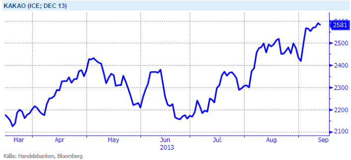 Den senaste tidens stigande Lean Hogspriser (gris) är drivet att dyrare priser på nötkött i USA. Fler och fler väljer därför fläsk, vilket har pressat upp priset till nivåer kring 90 cent/Ib. För oss som följt kakaons starka resa under året vet att den extrema hettan i juli vid Afrikas västkust följt av nederbörd under normalen i augusti hotar produktionen från Elfenbenskusten och Ghana. I skrivande stund handlas decemberkontraket över 2 590 dollar/ton, vilket är årshögsta för denna lyxiga mjuka råvara. Dock väntas bättre väderförhållanden för skörden som nu går mot slutfasen. Kaffe-priset däremot fortsätter att backa och har under veckan handlats till fyra års lägsta.