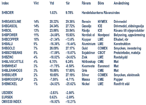 Handelsbankens råvaruindex består av de underliggande indexen för respektive råvara. Vikterna är bestämda till hälften från värdet av global produktion och till hälften från likviditeten i terminskontrakten.