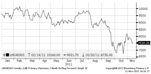 Även priset på nickel pressas av oron över Europas skuldkris vilket leder till minskad efterfrågan. Nickel har under veckan tappat 4% och handlas nu till 18 050 USD/ton. Trots att lager för nickel på LME har minskat denna vecka sjunker priset vilket visar att efterfrågan kraftigt har minskat. I förra råvarubrevet skrev vi om misstänkt överkapacitet på Nickel Pig Iron, vilket nu visats sig i minskad produktion. Marginalkostnaden för NPI ligger runt 23 603 USD/ton och med nickelpriser på nivåer på 19 000USD/ton känns det naturligt att fokusera på mer lönsamma metaller. Produktion av NPI under tredje kvartalet låg på 55 000 ton och förväntad produktionsnivå för fjärde kvartalet är 45 000ton. Vi tror fortsatt på sidledes rörelse för nickel, men även för aluminium och zink.