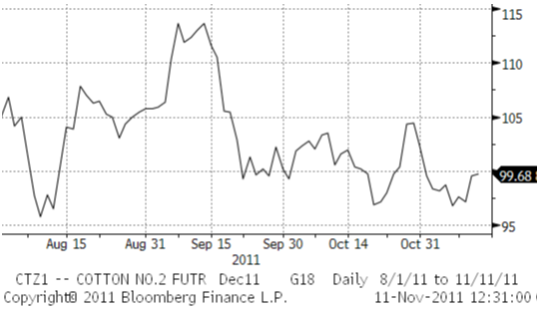Världsprognosen för nästkommande år visar på ett större ingående lager än vad som tidigare förväntats. Detta beror främst på uppjusteringar av produktion från Turkmenistan. Under nästa år förväntas dock de höga lagernivåerna kompenseras av en lägre världsproduktion från främst USA och Argentina. I Turkiet förväntas istället produktionen öka, detta väger dock inte volymmässigt lika tungt som minskningen i USA och Argentina. Världskonsumtionen förväntas minska marginellt vilket inte bör ha någon större effekt på lagernivåerna. Enligt en genomgång av analytikernas prisförväntningar om 2012, handlas bomullsterminerna högre än väntat.