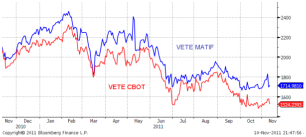 Vetepriset på Matif har gått ned något sedan förra torsdagens stängningskurs, likaså vetet i Chicago. Vetet i Chicago har påverkats negativt av en starkare amerikansk dollar. Onsdagens rapport från USDA (se nästa sida) innehöll inga större förändringar för vetet och fick därför liten påverkan på prisutvecklingen.