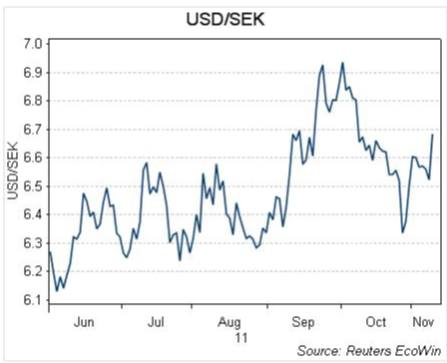 Kronan har hållit sig stabil mot euron under den senaste tvåveckorsperioden. Kronan ser faktiskt ut att gynnas av oron över södra Europa. När oron tilltar stärks kronan. Det är Sveriges goda statsfinanser som hjälper oss i en tid då fokus är högt på södra Europas usla statsfinanser. Vi har en fortsatt positiv syn på den svenska kronan gentemot euron då fokus på skuldkrisen väntas förbli högt. Detta till trots att den globala konjunkturen mattas av vilket historiskt sett har tenderat att leda till en kronförsvagning.
