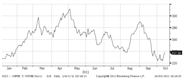 I slutet av förra veckan kunde vi se kaffepriset falla tillbaka ca 5 procent för att återhämta sig något i början av veckan efter en svagare dollar. I veckan har det spekulerats en del om mindre produktion av Arabica kaffe under det kommande året. Inte heller den brasilianska produktionen kommer kunna möta förväntningarna tror en del analytiker. Regnperioden har kommit igång lite för sent men regn väntas under andra delen av oktober i Brasilien. Det ser ut av att bli bra väder i Mexiko medan det regnat kanske lite för mycket i Centralamerika. Temperaturen beräknas blir under det normala efter helgen. Brasilien exporterade 2,56 miljoner bags kaffe i september, ned 14 procent från förra året. Den totala exporten för 2011 är 21,82 miljoner bags, en ökning med 6 procent från förra året.
