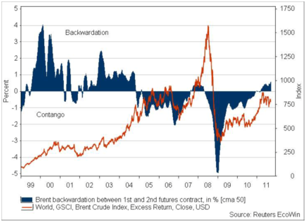 Spreaden mellan Brent och WTI har kommit ihop något och handlas nu på 24.5 som ett resultat av en något starkare efterfrågan i mellersta USA och förhoppningar om att på sikt få ut olja till raffinaderier vid kusten. Vi ser en mängd nya infrastrukturella projekt och dessa investeringar bör och kommer att få spreaden att komma ihop. Det kommer sannolikt dröja ytterligare något år innan dessa är på plats och spreaden kan börja komma ihop på allvar. Marknadskonsensus verkar ligga på en ca 10 dollar om 1-1.5 år. Vad gäller Brentkurvan ser vi återigen en ökad backwardation, se bilden ovan, vilken får en positiv rullningseffekt i indexet.