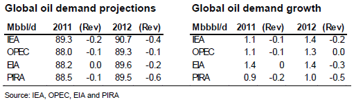 Brentkontraktet stärktes mot slutet av veckan och stängde med över 2.5 procent efter att riskaptiten återvänt samtidigt som Nordsjön drabbades av produktionsstörningar till följd av ovädret. Rapporter från de största energiorganen visar att de är något mindre optimistiska i sina prognoser för efterfrågan på kort sikt. Rapporterna från augusti visade främst en minskad efterfrågan för 2011 men nu har även förväntningarna för 2012 skruvats ned med 0.4 miljoner fat per dag till 90.7 miljoner fat per dag. IEA tillägger även att det är förenat med betydande nedåtrisk för detta antagande.