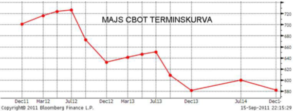 Terminspriserna på majs har gått ned under veckan påverkat av flera orsaker. I måndagens USDA-rapport (se nästa sida) var utgående globalt lager säsongen 2011/12 uppjusterat med 3 miljoner ton och den lägre amerikanska produktionen kompenserades till viss del av ökad produktion i flera andra områden. Samtidigt har regn i en del områden i USA lyckats lindra oron något, även om det kommer lite väl sent. Marknaden tycks nu ta hänsyn lite mer till globala förhållanden och inte enbart de amerikanska. Efterfrågan är ovanligt låg på amerikansk majs främst för export, hård konkurrens råder från fodervete för vilken tillgången är god och även allt hårdare konkurrens från majs med annat ursprung.