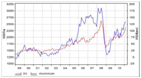 Nedgången i aluminium priset har varit mer dämpad än i andra metaller då priset har sjunkit till under marginalkostnaden för produktionen, ca 2,400 dollar vilket inneburit ett visst bortfall av kapacitet. Energikostnaden är för närvarande närmare 50 procent och bilden nere till höger ser ni korrelationen mot oljan.