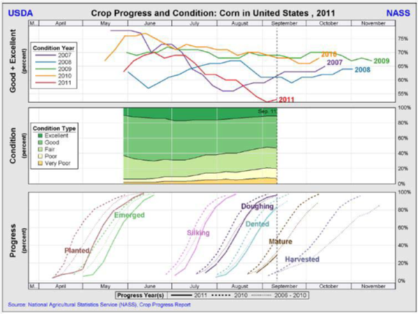 Andelen av den amerikanska majsen som bedöms vara i skicket ”good/excellent” var i måndagens rapport överraskande nog uppjusterad, upp en procentenhet till 53 procent. Klart lägre än förra årets 68 procent vid samma tidpunkt. Andelen av grödan som beräknas vara i skicket ”very poor/poor” justerades samtidigt ned med en procentenhet till 20 procent. Samma siffra förra året var klart lägre 12 procent. 29 procent av grödan var enligt USDA mogen för skörd, upp från förra veckans 18 procent men klart under förra årets 50 procent. Genomsnittet för de senaste fem åren är 33 procent vid samma tidpunkt.