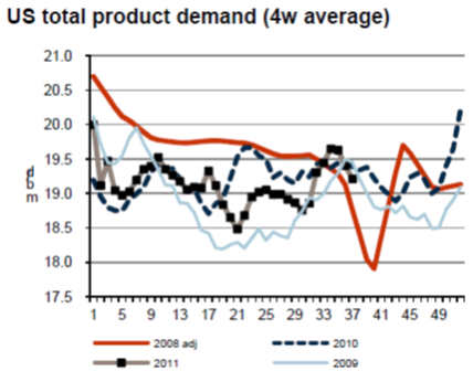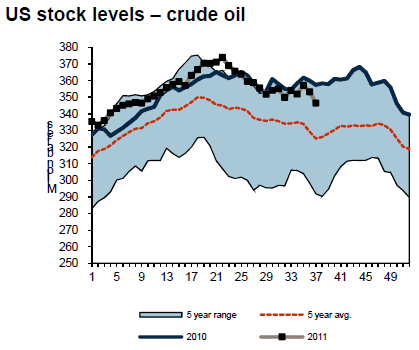 Veckans lagersiffror visade minskade råoljelagersiffror om 6.7 miljoner fat vilket var lägre än marknadens förväntningar om -3.1 miljoner fat. Mycket av detta kan tillskrivas de stängda oljeplattformarna i Mexikanska Golfen i samband med stormen Irene och minskad import. Bensinlagren steg med 1.9 miljoner fat (-0.5 miljoner fat förväntat) samtidigt som destillat ökade med 1.7 miljoner fat, 1 miljon mer än väntat.