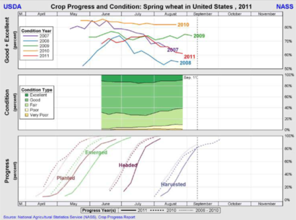 Enligt måndagens rapport från USDA var 83 procent av det amerikanska vårvetet skördat, upp från förra veckans 68 procent. Över förra årets 81 procent vid samma tidpunkt men fortfarande något efter genomsnittet för de senaste fem åren om 87 procent.