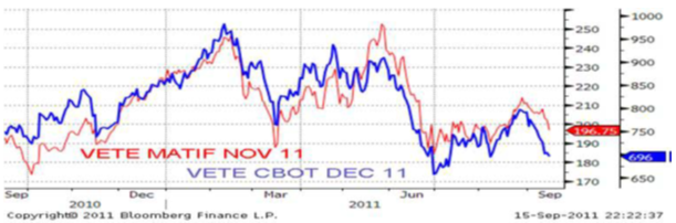 Vetet har fallit kraftigt i pris under veckan i både Chicago och Paris, nedgången har påverkats av ett flertal faktorer. Måndagens rapport från USDA (se nästa sida) överraskade marknaden med en oväntat stor ökning av globala utgående lager för säsongen 2011/12, 3 procent upp som följd av ökade lager i främst Kanada, EU och FSU.