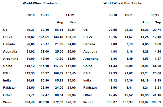Med ett lägre ingående lager och lägre konsumtion lyckades USDA trots en lägre produktion justera upp utgående världslager 2011/12 med nästan 3 miljoner ton.