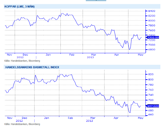Basmetallerna fortsätter att handlas upp och ner främst på främst Kina och USA data. Förra veckan steg metallerna men har kommit ner efter Kinaoro denna vecka. Antal byggnadstillstånd i USA kom in bättre än väntat för april månad och ligger nu på fem årshögsta, vilket ger stöd till bl.a. kopparpriset då nya hus kräver mycket koppar. Kopparn stärktes även under veckan efter Shanghailager visar lägsta lager på 8 månader.