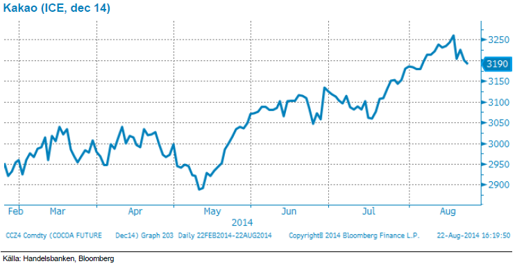 Årets första skörd (main crop) och även prognoserna för årets andra skörd (mid crop) ser lovande ut. Starka produktionssiffror rapporteras framförallt från Västafrika och Sydamerika. Ser man till den globala världsproduktionen väntas den stiga med 5,9 procent för 2013/2014 jämfört med föregående år. Även chokladkonsumtionen stiger globalt och allt fler chokladfabriker väljer att expandera i Asien där efterfrågan på choklad-produkter ökar i takt med den ökande medelklassen. Konsumtionen ser även ut att öka i Västafrika, som idag står för 45 procent av världens kakaoproduktion. Tidigare har kakao varit en delikat lyxråvara i länder med goda ekonomier men i takt med ökad levnadsstandard i tillväxtländerna ökar även kakaokonsumtionen i dessa länder. En stark uppåtgående trend som verkar hålla i sig.