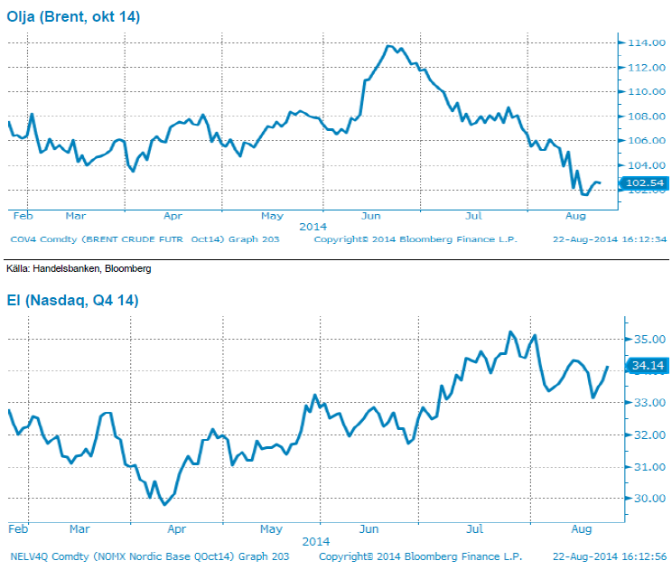 Oljepriset har stabiliserat sig under veckan efter det kraftiga fallet under augusti, handlas i skrivande stund på 102,5 USD/fat. Situationen kring Irak har på inget vis förbättrats, snarare tvärtom, men marknaden verkar tolka krisen där utan större risk för oljeleveranser.