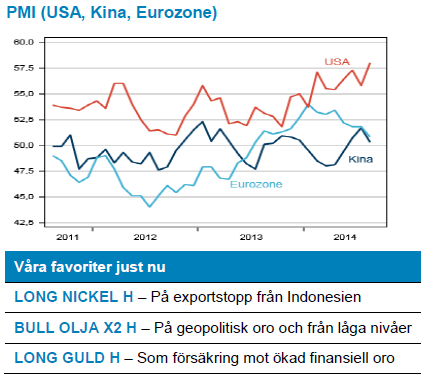 Generellt tror vi att det fallande oljepriset bäst förklaras av att marknaden tröttnat på riskpremietemat. Med den stigande produktionen i USA, som detta år slagit alla rekord, så förbättras hela tiden fundamenta. Någon gång ska det slå igenom i priset och det har nu börjat ske. Vi tror dock att oljan vänder upp på grund av oroligheterna i världen före den åter pressas av växande produktion på ett års sikt. Ett så här kraftigt ras brukar följas av en rekyl, så vi tycker oljan är köpvärd på denna nivå.