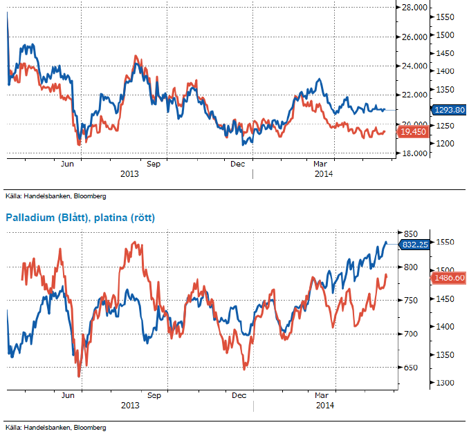 De två senaste veckorna har sett ädelmetallerna stiga i pris, framför allt våra favoriter platina och palladium, med 3,8 respektive 3,5 procent vardera. Guldet har stigit marginellt, men mot bakgrund av att dollarn stärkts under perioden måste vi tolka utvecklingen som ganska stark. Volatiliteten är däremot oerhört låg, och varken Fed-protokoll, ekonomisk statistik eller Ukraina-utvecklingen har kunnat skapa några större rörelser.