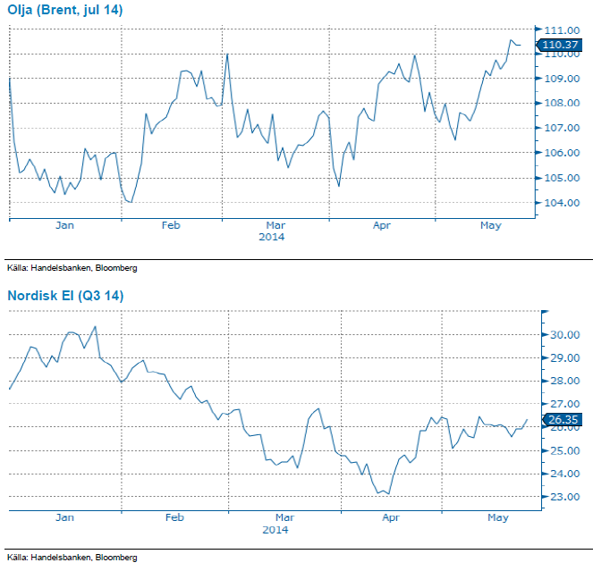 Oljan har under veckan klättrat mot toppen av årets handelsrange och nådde årshögsta strax över 111 USD/ton. Geopolitisk oro är som vanligt den största drivkraften men även kraftigt fallande lager på råolja i USA har pressat upp priset. Spänningarna ökar inför presidentvalet i Ukraina på söndag. Putin försäkrar att Ryssland kommer respektera valutgången och stötta den valda presidenten, samtidigt fortsätter rapporterna om blodiga strider från området kring Donetsk. Fortsatt oroligt även i Libyen där parlamentsval väntas i juni. Vi ser att oljan nu handlas med en riskpremie som, när situationen förhoppningsvis stabiliseras, kommer pysa ut och med fallande oljepris som följd.