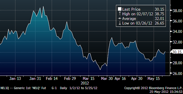 Ser vi till den korta kurvan så är spotpriserna riktigt låga och väntas så vara även under nästa vecka. De höga temperaturerna gör att vattenproducenter har svårt att upprätthålla spotpriset på någon högre nivå till följd av den kraftiga snösmältningen. För att sammanfatta läget talar flera faktorer för att vi kommer att ligga kvar på dessa låga nivåer och om inte prognoserna slår om till betydligt torrare än de vi ser idag bör Q3 2012 kunna falla tillbaka någon euro under inledningen av nästa vecka.