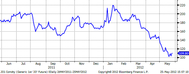 Priset på apelsinjuice fortsätter på sin låga nivå till följd av ökat utbud och den rådande ekonomiska situationen i Europa håller efterfrågan på fortsatt låga nivåer. Väderförhållandena har varit gynnsamma och skördarna är goda. Florida närmar sig orkansäsongen och antalet namngivna orkaner motsvarar tidigare år även om man i år inväntar orkaner något tidigare på säsongen. Även om säsongens tidiga orkaner i sig inte verkar utgöra något större hot för skörden påminner de marknaden om risken och tillfälliga uppgångar i priset har setts. Brasiliens Real har tappat 5,5 % mot USD sedan jan 2012.