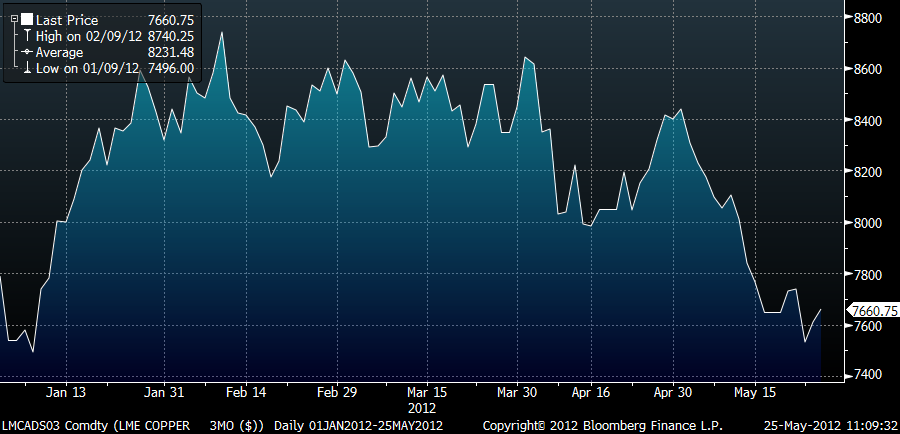 Kopparpriset har pendlat upp och ner i pris under veckan för att stänga på ungefär oförändrat. Sedan årets början är priset ned ca 1.7 %. Koppar har den senaste tiden tagit stryk på grund av oron kring Grekland och världsekonomin. Som bekant anses metallen vara en ledande indikator för världskonjunkturen.