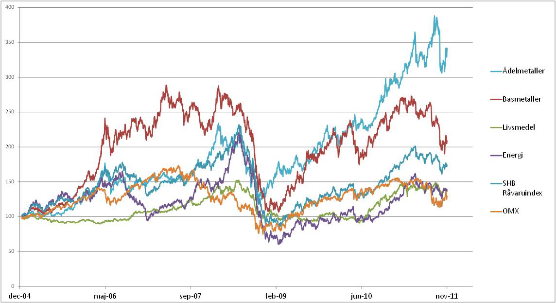 Från och med nästa torsdag, den 1 december, kan du spetsa till din positionering inom råvaror utan att behöva handla enskilda råvaror, då vi gör våra nya råvaruindex handelsbara. Dessa är ett Energiindex, ett Basmetallindex, ett Livsmedelsindex och ett Ädelmetallindex. Detta kan sägas vara en bild av hur råvarumarknaden idag analyseras, och det är en indelning där de ingående råvarorna i varje sektorindex drivs av likartade faktorer, men som ändå ger en bra riskspridning jämfört med att handla en enskild råvara. Dessa index innehåller också lite fler råvaror än vad som ingår i Handelsbankens breda råvaruindex.