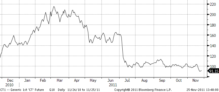 Skuldkrisen och inbromsningen in den globala tillväxten återspeglas även i fallande bomullspriser där priset fallit närmare10 procent de senaste två veckorna. Efterfrågan på världsmarknaden av bomull rapporteras bli 1,7 procent lägre än väntat jämfört med förra månadens siffror och därmed väntas ett stort överskott av bomull. I oktober släppte USDA följande bomullssiffror; Världens export 2011/2012 av bomull väntas stiga med 3 procent, där Australien väntas nå all-time-high, en ökning med 71 procent från tidigare år. Även Brasiliens export väntas stiga kraftigt, en ökning med 90 procent medan USA, världens ledande bomullsexportör, väntas minska sin export med 20 procent p.g.a. lägre lager och hårdare konkurrens om marknadsandel.