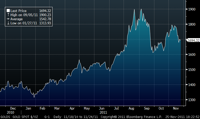 Sentimentet på basmetallerna har försvagats och utöver den svaga utvecklingen på världens börser och en stärkt dollar ser vi något svagare kinesiska siffror. Preliminära PMI siffror för november i landet landar på nivåer under 50 (index över 50 indikerar tillväxt inom industrin) och kanske så lågt som 48. Det har talats mycket om produktionsneddragningar i takt med att deflationsoron tilltar, speciellt på Nickel pig Iron (lågkostnadssubstitut till Nickel), zink och aluminium. På den senare har förvånansvärt lite dragits ned trots att vi handlar en bra bit under marginalkostnadsproduktion. Vad gäller Zink handlar vi ca 25 procent över cash-cost, Nickel 30-35 procent och på Koppar strax över 80 procent över. Nedan en bild på LME Index som tappat 3.65 procent under veckan.
