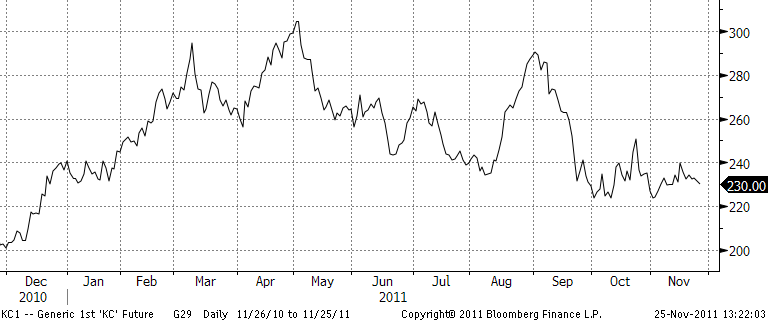 Kaffepriset har pendlat mellan 226 och 250 USd/Ib under de senaste två månaderna. Handlare fortsätter att vara bearish inför nästa års priser främst p.g.a. fortsatt rekordskörd från Brasilien och Vietnam. Gynnsam nederbörd väntas denna vecka i Brasilien medan torrare väder är rapporterat i Vietnam vilket anses vara bra för skörden. Det rapporteras fortfarande om skadad skörd, orsakad av det kraftiga regnet, i Centralafrika och lägre produktion väntas i Colombia. Det spekuleras kring att Vietnams export kan ha minskat med 28 procent den här månaden. Exporten för de första 11 månaderna av året var estimerad till 1,08 miljoner ton, en ökning med 2,4 procent från förra året.
